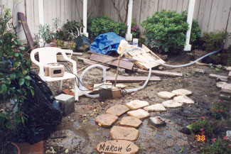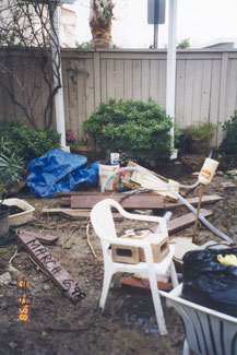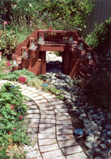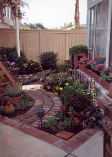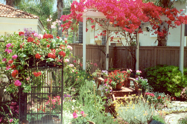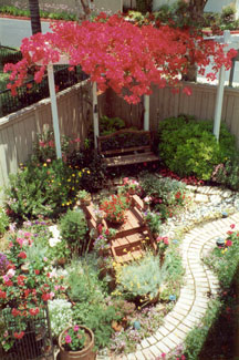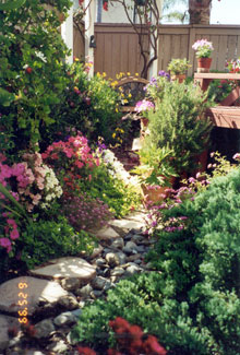 PROJECT: DESIGNED and LANDSCAPED POINTS CONSIDERED IN DESIGNING LANDSCAPING: 1) Cost: Replacing former redwood deck would be too expensive. Plants and informal hardscape less costly (i.e., stone and brick pathways that meander through flower beds). Hardscape should be planned with a variety of materials, textures, and colors: Redwood bridge, white wooden flower trellis (already in place), park bench (oak and wrought iron with green patina), river rocks, brick path, stone path, various flower pots and planters. Black wrought-iron bird cage will be incorporated into the design. 2) Topography: Homeowners' Association prohibits changes in lay of land. This yard has large depression in the middle, where drainage pipe is located. a) During El Niño rainstorms, yard flooded because drainage system could not handle excessive amounts of water within a short time. SOLUTION : Install sump pump. ( See SUMP PUMP section.) b) The pipe grate, depression, and sump pump are unsightly and need to be camouflaged. SOLUTION : Landscape according to way water flows into yard by laying decorative rocks for a “stream bed.” Then design and construct an attractive redwood bridge to span the stream and hide the sump pump, etc. ( See GARDEN BRIDGE section.) 3) Use: We want garden to be a pleasant place to relax and entertain during the day and evening; therefore, outdoor lighting needs to be enhanced. 4) Soil: Solid clay. Nothing will grow in it. Large amounts of top soil must be hauled in. 5) Plants (Sun and Water—“Macroclimate” and “Microclimates”): Plants must be chosen not just for their suitability in the macroclimate ( Southern California ) but also according to the specific microclimates in the yard. Southern California's macroclimate is usually warm, sunny, and dry, but this particular yard is surrounded by high fences (giving a lot of shade) and the Association's sprinkler system, which maintains shrubbery just outside the fences. a) Therefore, in damp, shady places, many popular drought-tolerant plants will not survive. b) Plants in the middle of the yard must tolerate very wet soil and full sun. c) Higher areas will sustain plants that like less water. But some of the high spots get full sun, while others get only part sun. 6) Plants (Design): The following features must also be taken into consideration when choosing plants: a) PERENNIALS: Annual plants, which usually die after one season, are too time consuming and expensive to replace. Perennials are a better choice here. b) BLOOMING PERIOD: Prefer long blooming period so that garden has flowers as many months of the year as possible. c) COLOR of FLOWERS and LEAVES on PLANT: Red, pink, blue, purple, and lavender are the preferred colors. Only a few should be white and any yellows must be very bright (not the color of dead leaves). Different leaf colors, shapes, and textures add variety: 1 COLOR: Examples: Blue, red, yellow, or gray tint. 2 SHAPES: Examples: Long and narrow, ovate, serrated or smooth edged, palmate, lobed. 3 TEXTURES: Examples: Waxy, fuzzy, succulent, etc. d) HEIGHT and POSITION OF PLANT: Shorter plants, of course, must be planted in front of taller ones, and flower color needs to be considered so that plants are positioned in a harmonious color scheme. Also, layout must include plants and shrubs already in yard. 7) Plants (Maintenance): b) HARDINESS: Very fragile plants are not suitable because they need high maintenance. 8) Plants (Dangers): a) SAFETY HAZARDS: Avoid poisonous plants or those with sharp blades, stickers, or thorns, especially if children and pets will be playing in the yard. b) ROOT SYSTEMS: Consider potential problems caused by the plants' roots, especially near pipes, concrete, fence, and other plants. -- Janet Gavin |
