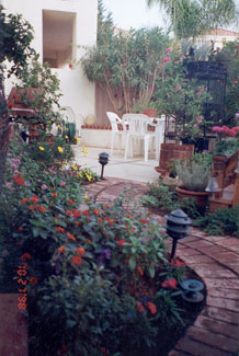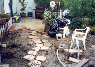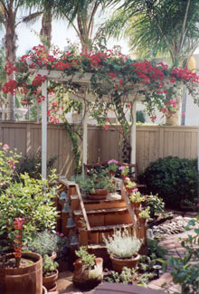 PROJECT: DESIGNED and LANDSCAPED POINTS CONSIDERED IN DESIGNING LANDSCAPING: 1) Cost: Replacing former redwood deck would be too expensive. Plants and informal hardscape less costly (i.e., stone and brick pathways that meander through flower beds). Hardscape should be planned with a variety of materials, textures, and colors: Redwood bridge, white wooden flower trellis (already in place), park bench (oak and wrought iron with green patina), river rocks, brick path, stone path, various flower pots and planters. Black wrought-iron bird cage will be incorporated into the design. 2) Topography: Homeowners' Association prohibits changes in lay of land. This yard has large depression in the middle, where drainage pipe is located. a) During El Niño rainstorms, yard flooded because drainage system could not handle excessive amounts of water within a short time. SOLUTION : Install sump pump. ( See SUMP PUMP section.) b) The pipe grate, depression, and sump pump are unsightly and need to be camouflaged. SOLUTION : Landscape according to way water flows into yard by laying decorative rocks for a “stream bed.” Then design and construct an attractive redwood bridge to span the stream and hide the sump pump, etc. ( See GARDEN BRIDGE section.) 3) Use: We want garden to be a pleasant place to relax and entertain during the day and evening; therefore, outdoor lighting needs to be enhanced. 4) Soil: Solid clay. Nothing will grow in it. Large amounts of top soil must be hauled in. 5) Plants (Sun and Water—“Macroclimate” and “Microclimates”): Plants must be chosen not just for their suitability in the macroclimate ( Southern California ) but also according to the specific microclimates in the yard. Southern California's macroclimate is usually warm, sunny, and dry, but this particular yard is surrounded by high fences (giving a lot of shade) and the Association's sprinkler system, which maintains shrubbery just outside the fences. a) Therefore, in damp, shady places, many popular drought-tolerant plants will not survive. b) Plants in the middle of the yard must tolerate very wet soil and full sun. c) Higher areas will sustain plants that like less water. But some of the high spots get full sun, while others get only part sun. 6) Plants (Design): The following features must also be taken into consideration when choosing plants: a) PERENNIALS: Annual plants, which usually die after one season, are too time consuming and expensive to replace. Perennials are a better choice here. b) BLOOMING PERIOD: Prefer long blooming period so that garden has flowers as many months of the year as possible. c) COLOR of FLOWERS and LEAVES on PLANT: Red, pink, blue, purple, and lavender are the preferred colors. Only a few should be white and any yellows must be very bright (not the color of dead leaves). Different leaf colors, shapes, and textures add variety: 1 COLOR: Examples: Blue, red, yellow, or gray tint. 2 SHAPES: Examples: Long and narrow, ovate, serrated or smooth edged, palmate, lobed. 3 TEXTURES: Examples: Waxy, fuzzy, succulent, etc. d) HEIGHT and POSITION OF PLANT: Shorter plants, of course, must be planted in front of taller ones, and flower color needs to be considered so that plants are positioned in a harmonious color scheme. Also, layout must include plants and shrubs already in yard. 7) Plants (Maintenance): b) HARDINESS: Very fragile plants are not suitable because they need high maintenance. 8) Plants (Dangers): a) SAFETY HAZARDS: Avoid poisonous plants or those with sharp blades, stickers, or thorns, especially if children and pets will be playing in the yard. b) ROOT SYSTEMS: Consider potential problems caused by the plants' roots, especially near pipes, concrete, fence, and other plants. -- Janet Gavin |