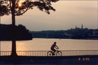 | Potomac River at Sunset. Photo taken from grounds of Watergate Hotel. (Georgetown and Key Bridge in background.) June 1995 |